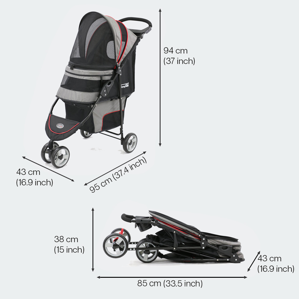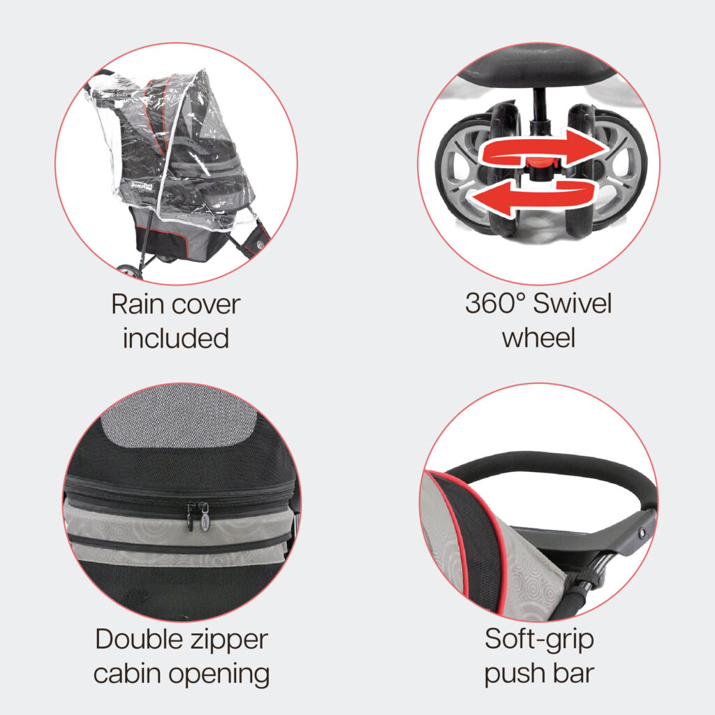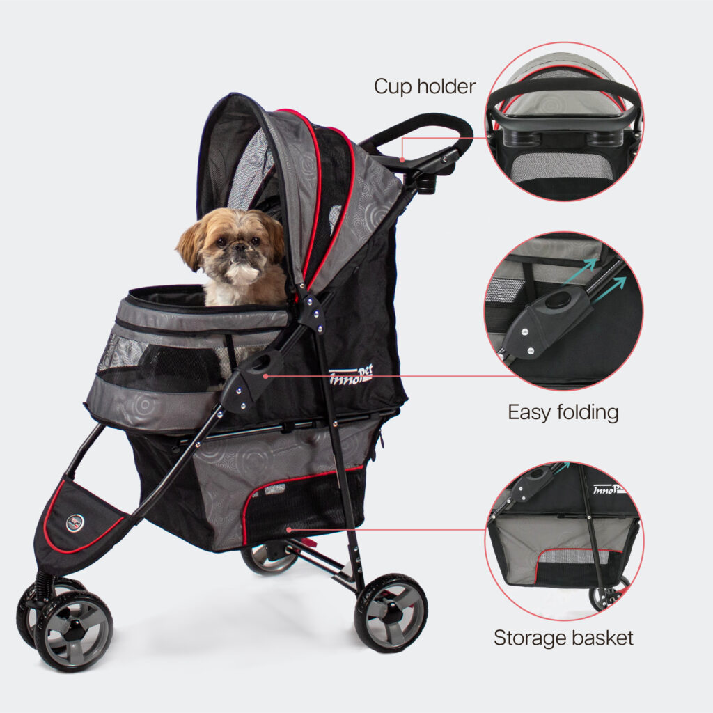De InnoPet Avenue in stijlvol grijs met rood is een lichtgewicht, maar robuuste oplossing voor stadsuitjes met uw huisdier. Ideaal voor kleine honden, katten of puppy’s tot 11 kg, biedt deze buggy moeiteloze mobiliteit en gemoedsrust. Ondanks de royale binnenruimte weegt hij slechts zo’n 5,5–6 kg, waardoor hij eenvoudig te hanteren en op te bergen is, en hij vouwt in enkele seconden plat tot een compact formaat dat in de meeste kofferruimtes past. Het enkele voorwiel kan 360° draaien, wat soepele navigatie op trottoirs en smalle paden mogelijk maakt, en de ingebouwde vering zorgt voor een comfortabele rit, zelfs over hobbelige ondergrond. De veilige kap met gaasvensters laat uw huisdier genieten van frisse lucht en uitzicht, terwijl een verborgen stalen beugel aan de voorkant stabiliteit en veiligheid biedt. Binnenin ligt een comfortabel wasbaar matras op een ruime cabine die met twee verstelbare riemen wordt verankerd voor extra zekerheid. De Avenue denkt ook aan het weer met een inbegrepen regenhoes, terwijl praktische details als een opbergbak onder de cabine, een bekerhouder aan het handvat en achterwielremmen het leven van de eigenaar vergemakkelijken. Ontworpen met aandacht voor stijl, comfort en dagelijks gemak, brengt de InnoPet Avenue veiligheid en gebruiksvriendelijkheid naar elke wandeling.